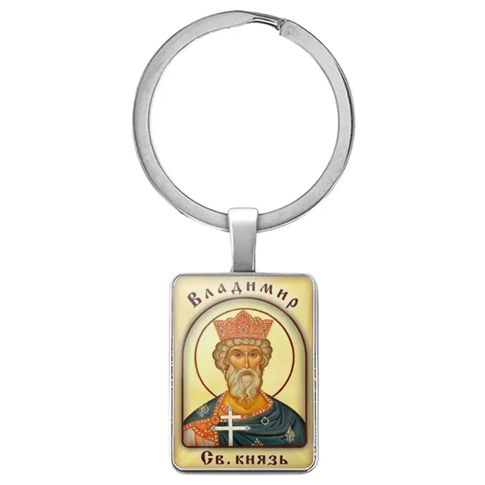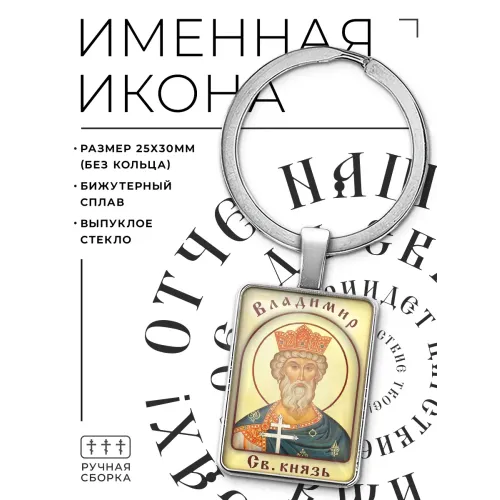 Именная иконка-брелок Владимир — металлический аксессуар с изображением святого покровителя под объёмной стеклянной линзой.