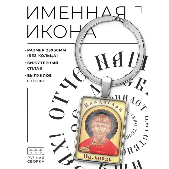 Именная иконка-брелок Владислав — это стильный металлический аксессуар, который сочетает в себе функциональность и духовную значимость. Изображение святого покровителя под объёмной стеклянной линзой придаёт брелку особую атмосферу благословения.