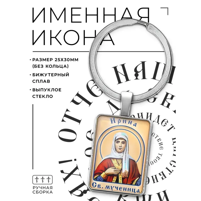 Именная иконка-брелок Ирина — это стильный металлический аксессуар, который сочетает в себе красоту и духовность. Изображение святого покровителя под объёмной стеклянной линзой придаёт этому брелку особый смысл, делая его не только практичным предметом, но и символом защиты.