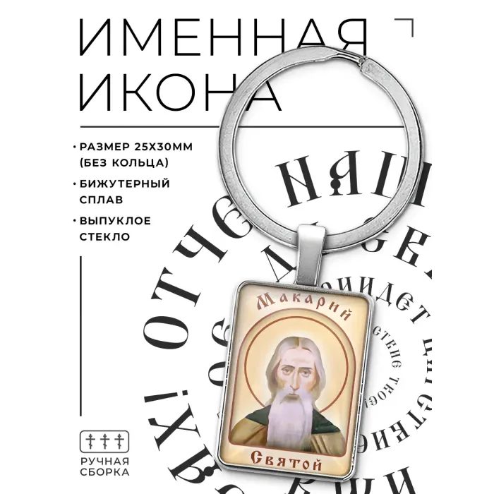 Металлический брелок-иконка с изображением святого, защищённый объёмной стеклянной линзой.