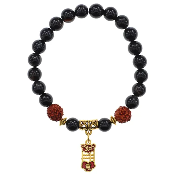Стрейч-браслет из натурального камня с рудракшей и металлической подвеской.
