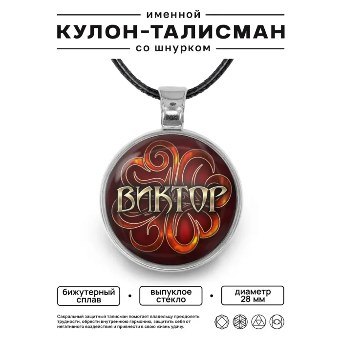 Именной кулон-талисман Виктор — это уникальное украшение, которое не только радует глаз, но и обладает глубоким символическим значением. Этот сакральный защитный символ традиционно используется для преодоления трудностей и обретения внутренней гармонии. Изготовленный из бижутерного сплава с покрытием под серебро, кулон имеет диаметр 28 мм и упакован в прозрачный пакет. В комплект входит стильный черный шнурок с застёжкой, что делает его удобным для ношения. Такой талисман станет отличным подарком для тех, кто стремится привлечь удачу и защитить себя от негативного воздействия.