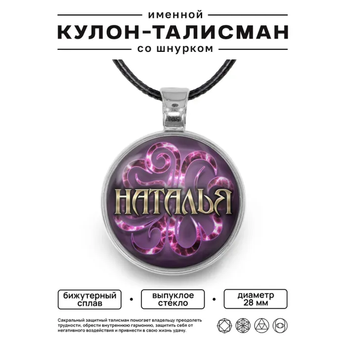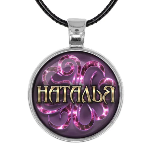 Именной кулон-талисман с гравировкой имени «Наталья». Материал — бижутерный сплав с покрытием под серебро.