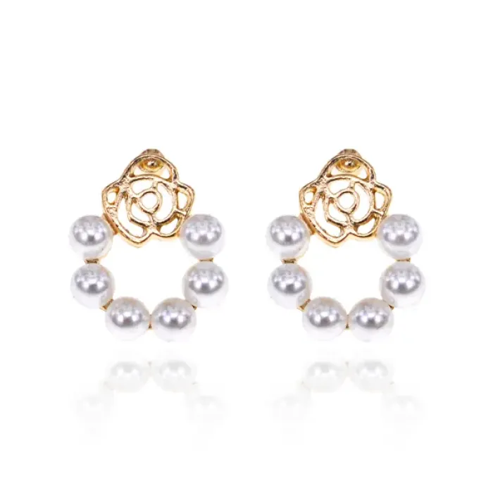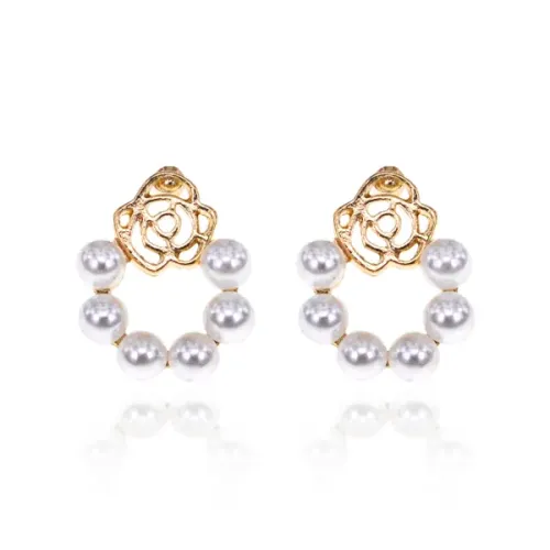 Серьги-пусеты с дизайном в виде розы и вставками из искусственного жемчуга.
