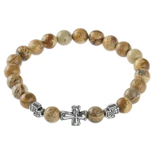 Православный стрейч-браслет из натурального камня, который сочетает в себе красоту и глубокий символизм. Этот браслет, выполненный из коричневой яшмы, традиционно используется для очищения и сосредоточения энергии. Внутренний диаметр составляет примерно 5,2 - 5,5 см, а диаметр каменных бусин — 8 мм.