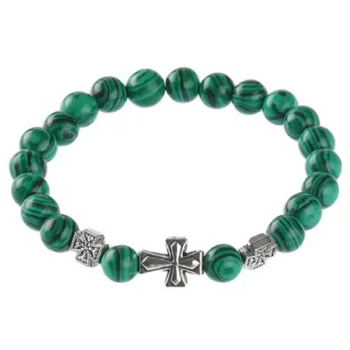 Православный стрейч-браслет из натурального малахита с надписью «Спаси и сохрани».