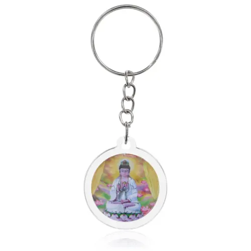 Брелок с изображением Гуаньинь. Изготовлен из пластика и металла с покрытием под серебро.