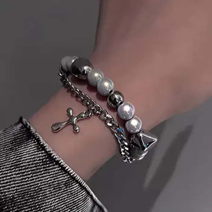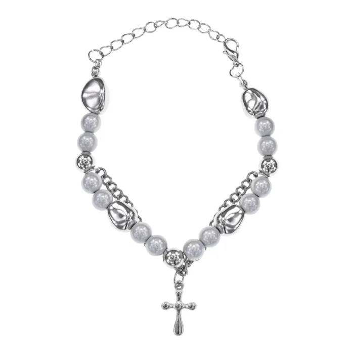 Бижутерный браслет с подвеской в виде креста и светоотражающими бусинами.