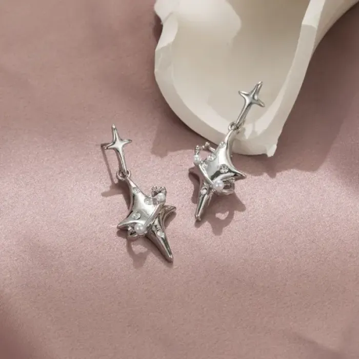 Серьги «Две звезды со стразами» — бижутерное украшение с покрытием под серебро, вставками из искусственного жемчуга и стразов, на пусете (гвоздике).