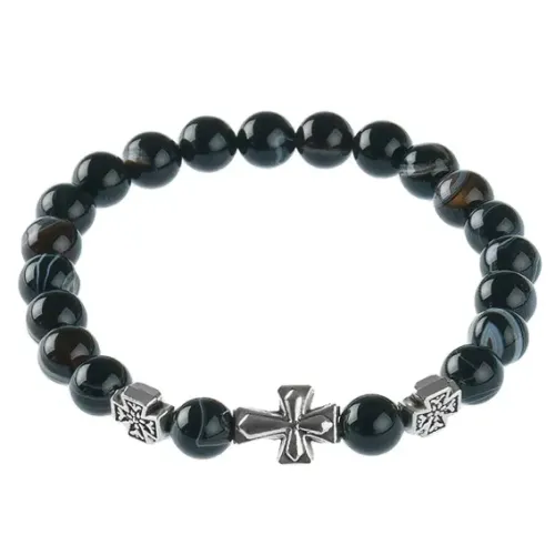 Православный стрейч-браслет из натурального черного агата с надписью "Спаси и сохрани".