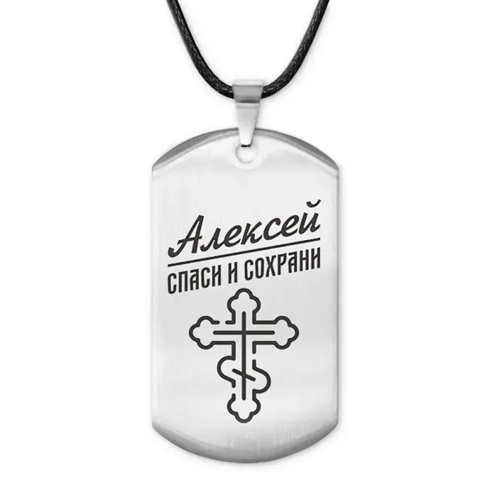 Мужской именной кулон-жетон из нержавеющей стали с лазерным изображением и зеркальной поверхностью.
