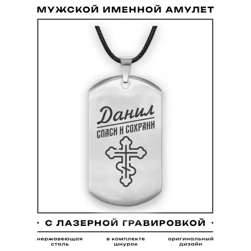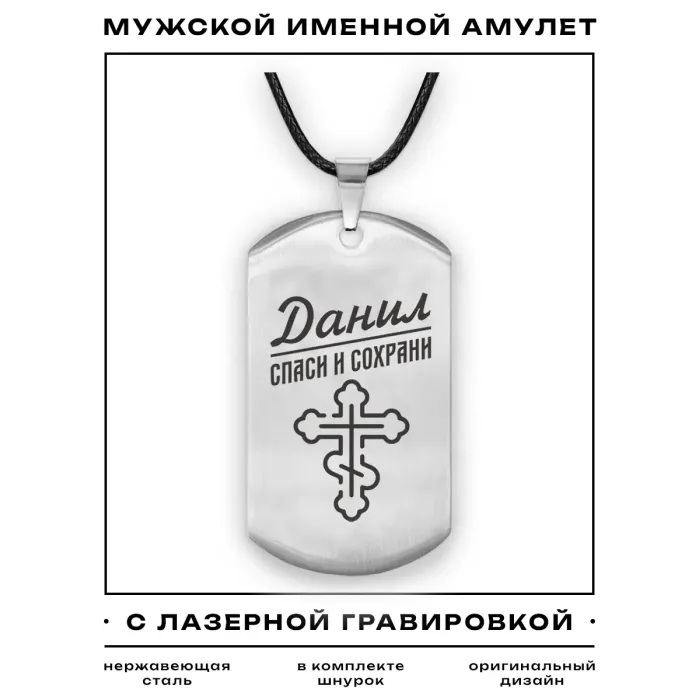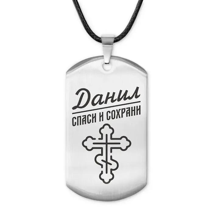 Именной кулон-жетон из нержавеющей стали с лазерной гравировкой изображения на одной стороне.