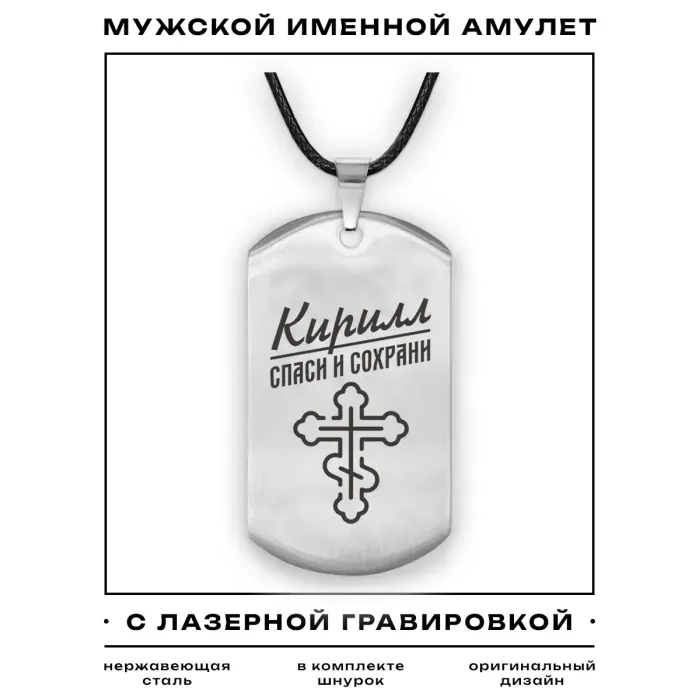 Именной кулон-жетон из нержавеющей стали с лазерной гравировкой на одной стороне.