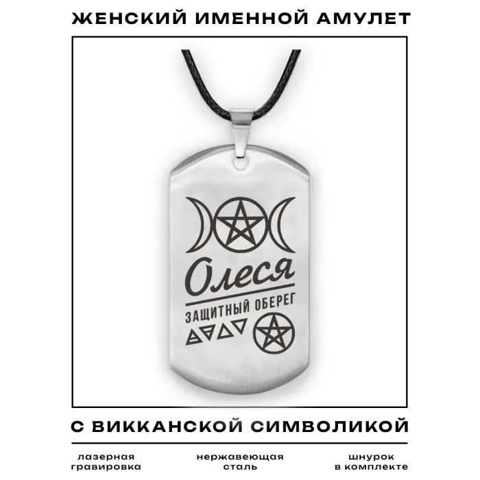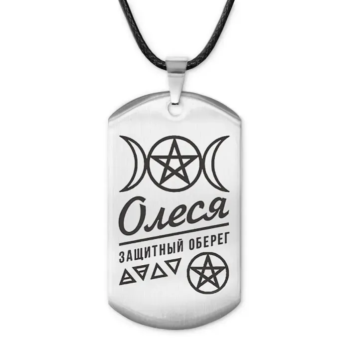 Именной кулон-жетон из полированной нержавеющей стали с лазерной гравировкой изображения на одной стороне.