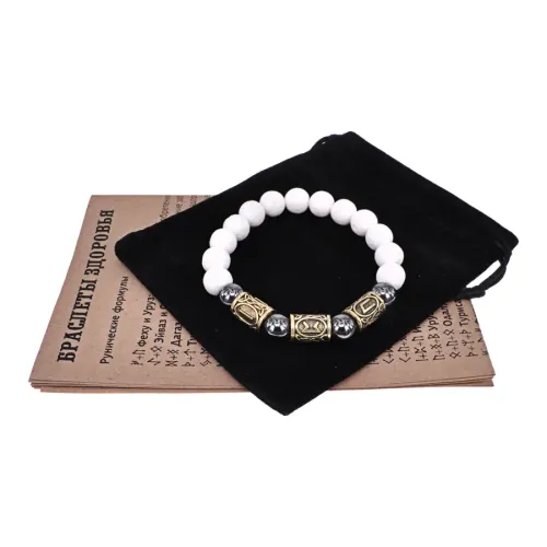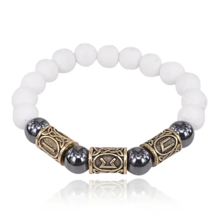 - Бусины диаметром 10 мм выполнены из прочного камня, а руны изготовлены из бижутерного сплава с золотым покрытием.