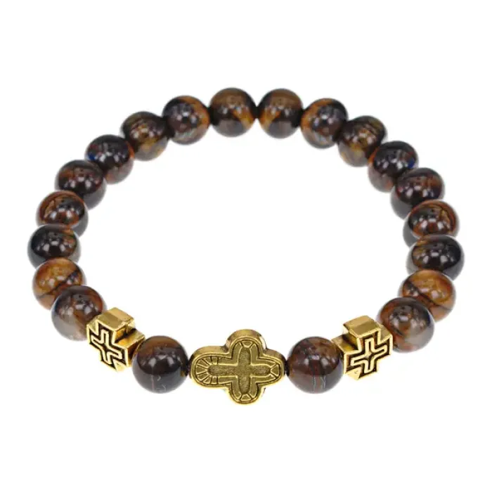 Православный стрейч-браслет из натурального камня Тигровый глаз с надписью «Спаси и сохрани».