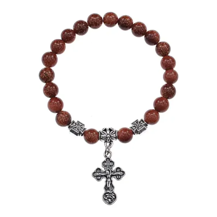 Православный стрейч-браслет из коричневого авантюрина с надписью «Спаси и сохрани».