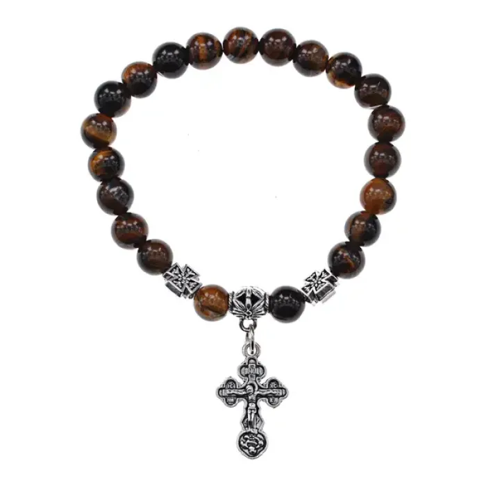 Православный стрейч-браслет из натурального камня тигровый глаз с подвеской.