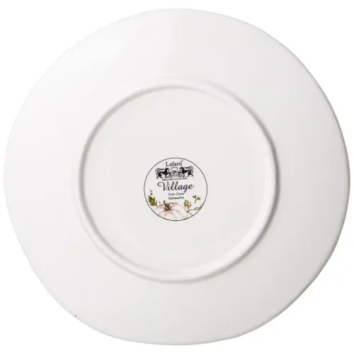 Тарелка выполнена из тонкой доломитовой керамики, материала, известного повышенной прочностью. Дизайн модели включает однотонный кант. Коллекция Village также включает обеденные тарелки и салатники различных размеров.