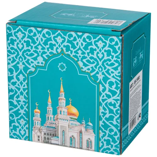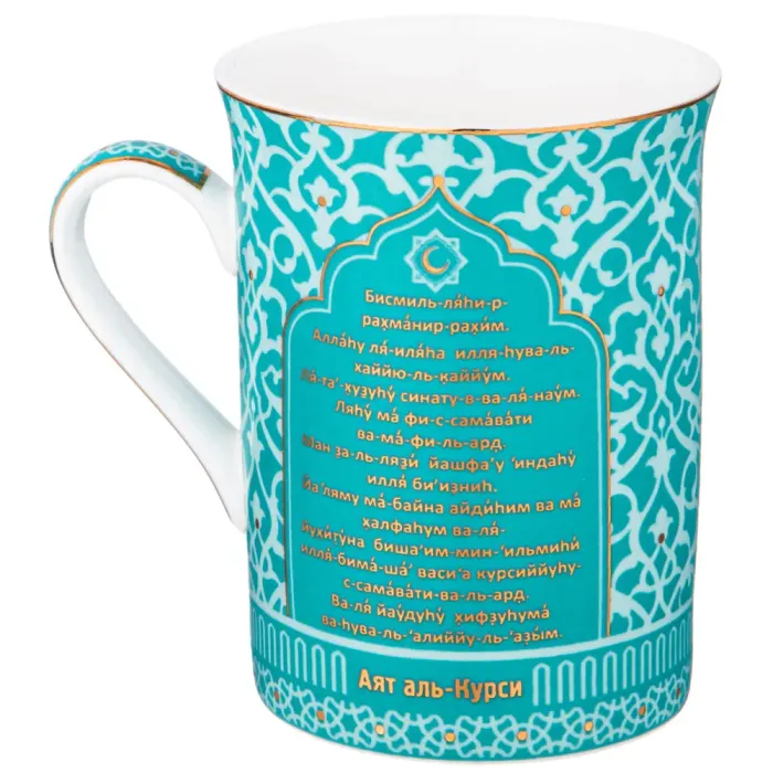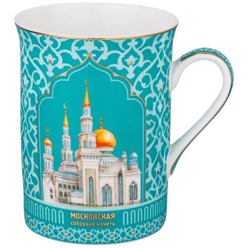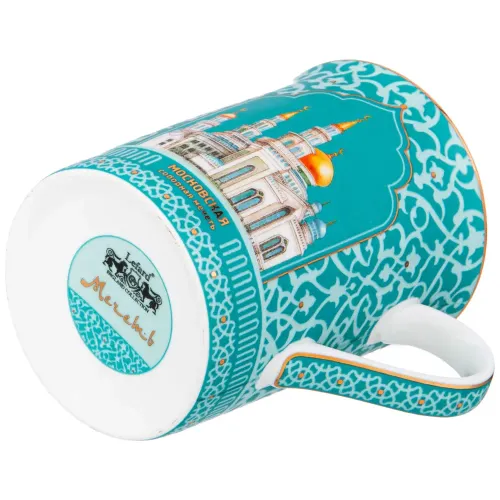 Кружка изготовлена из фарфора, что обеспечивает её прочность. Поверхность украшена изображением мечети и текстом, нанесённым с использованием золотой отделки. Ручка имеет классическую форму для удобного захвата.