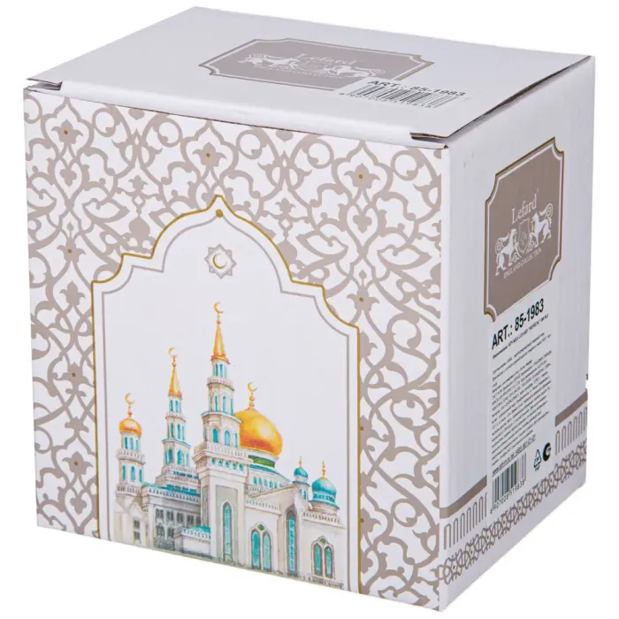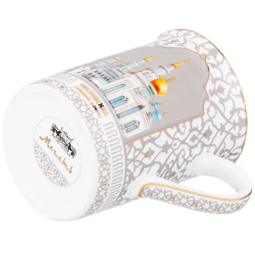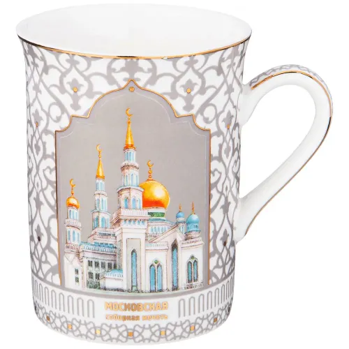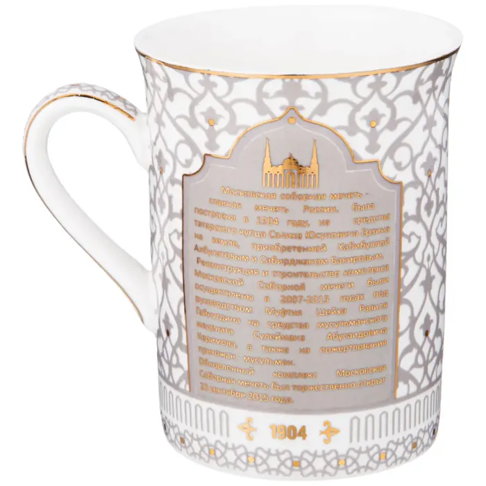 Кружка изготовлена из фарфора, что обеспечивает её прочность и гигиеничность. Поверхность изделия декорирована восточным орнаментом, изображением мечети, а также транскрипцией сур из Корана на кириллице и исторической справкой о Московской соборной мечети. Отделка золотом придаёт декору контрастность.