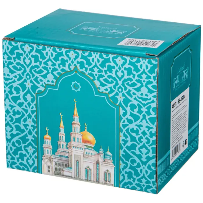 Для сохранения декоративного покрытия рекомендуется ручная мойка. Кружка поставляется в цветной или подарочной коробке, что делает её подходящим вариантом для подарка на мусульманские праздники.