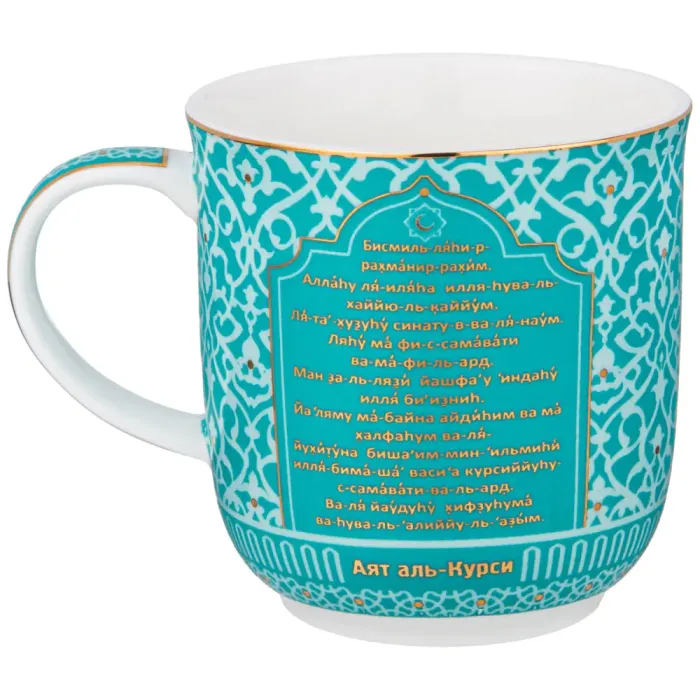 Кружка изготовлена из фарфора, что обеспечивает её прочность и гигиеничность. На поверхность нанесена транскрипция Сур из Корана на кириллице. Декоративные элементы требуют бережного обращения для сохранения внешнего вида.