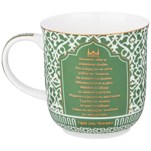 Кружка изготовлена из тонкостенного фарфора, что обеспечивает её лёгкость. Поверхность украшена восточным орнаментом, изображением мечети и текстом на кириллице с использованием золотой отделки. Декоративные элементы нанесены на глазурованную поверхность.