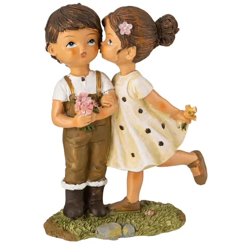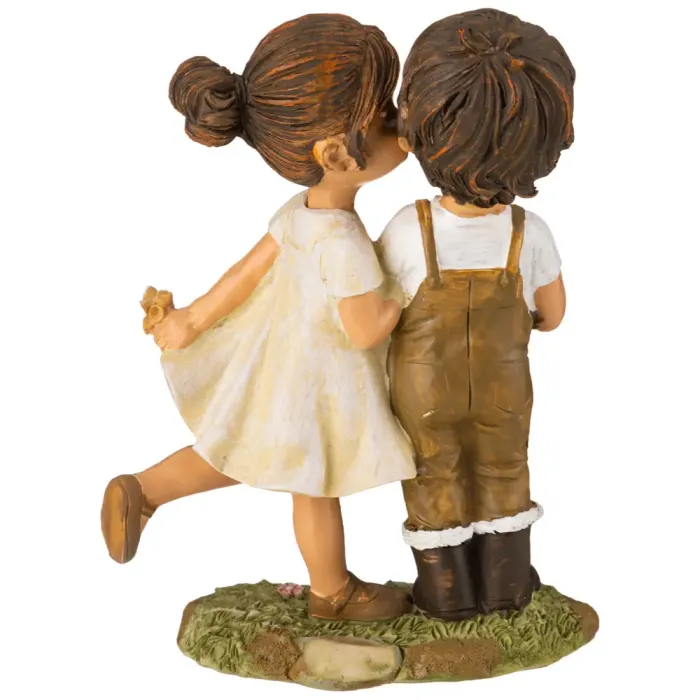 Полистоун — прочный материал, обеспечивающий долговечность изделия. Композиция статуэтки изображает двух детей в игре, создавая атмосферу уюта и радости. Компактные размеры делают её подходящей для различных мест размещения: на полке, столе или каминной полке.