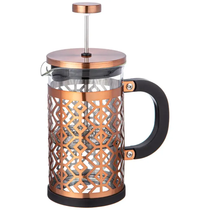 Корпус изготовлен из жаропрочного стекла, устойчивого к высоким температурам. Конструкция включает металлические и пластиковые элементы, такие как пресс-фильтр и ручка. Фильтр с простым механизмом позволяет эффективно отделять гущу при заваривании кофе грубого помола или листового чая.