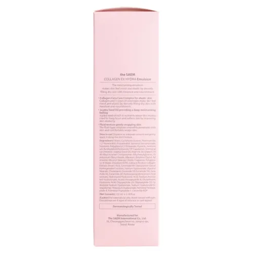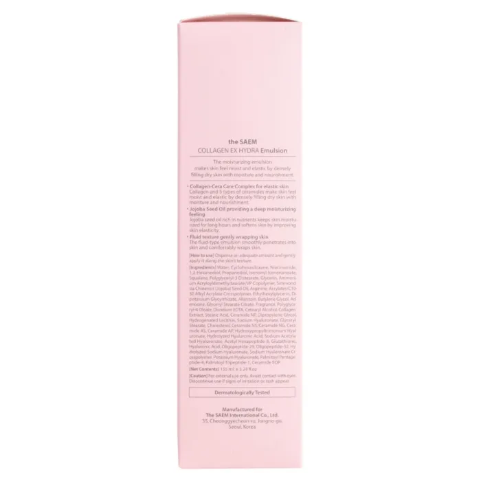 Увлажняющая эмульсия для лица Collagen EX Hydra Emulsion от The Saem предназначена для глубокого увлажнения и питания сухой кожи. Продукт содержит низкомолекулярный рыбный коллаген и комплекс из пяти видов церамидов, которые способствуют повышению упругости и увлажненности кожи. Масло жожоба в составе придаёт коже эластичность, смягчает её и обеспечивает длительное увлажнение. Эмульсия обладает низкой вязкостью, что позволяет ей быстро впитываться без ощущения жирности.