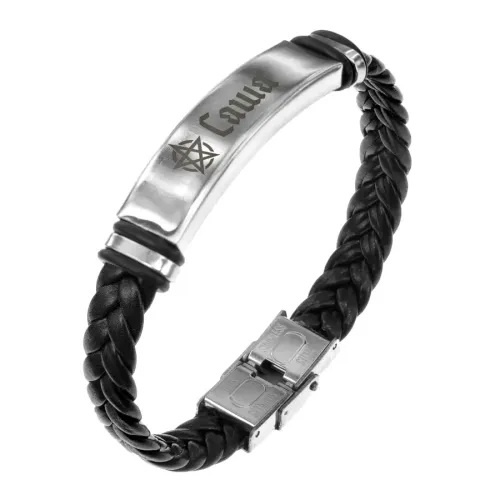 Именной браслет-оберег из кожи и нержавеющей стали с плетёным дизайном и индивидуальной гравировкой.