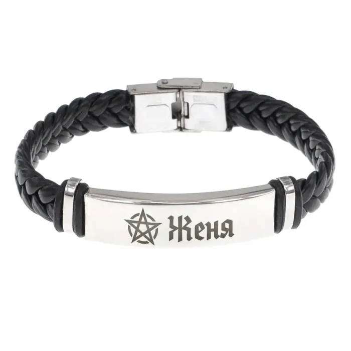 Именной браслет-оберег из кожи и нержавеющей стали с плетёным дизайном и гравировкой.