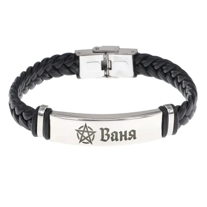Именной браслет-оберег из кожи и нержавеющей стали с плетёной конструкцией и индивидуальной гравировкой.