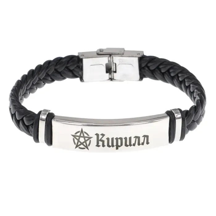Именной браслет-оберег из кожи и нержавеющей стали с плетёной конструкцией и гравировкой.