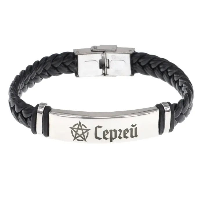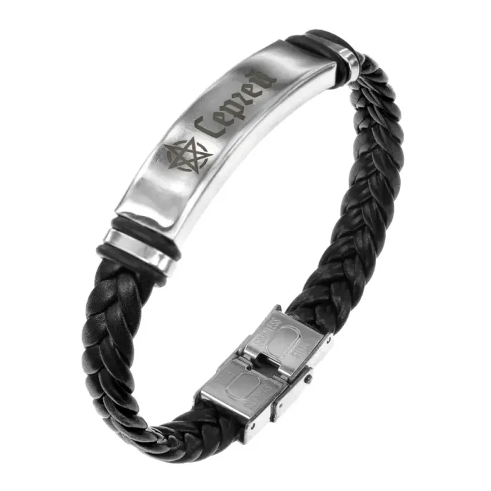 Именной браслет-оберег из кожи и нержавеющей стали с плетёной конструкцией и гравировкой.
