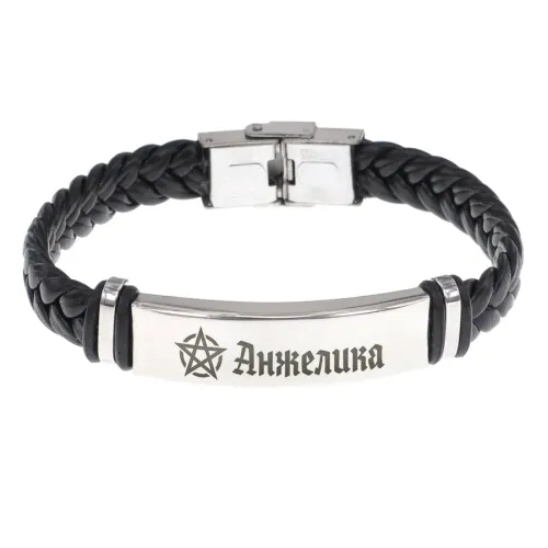 Именной браслет-оберег из кожи и нержавеющей стали с индивидуальной гравировкой и плетёным дизайном.