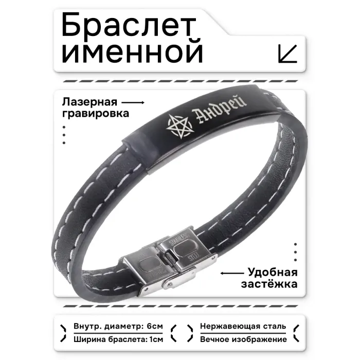 Именной браслет-оберег из кожи и нержавеющей стали с гравировкой.