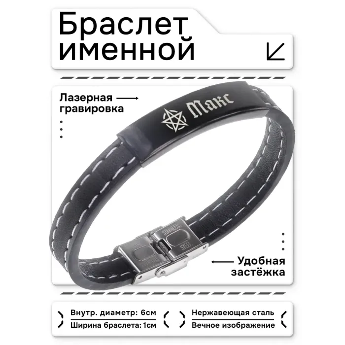 Именной браслет-оберег из кожи и нержавеющей стали с индивидуальной гравировкой.