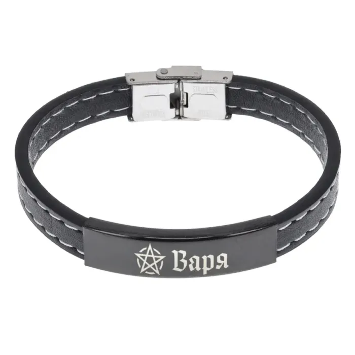 Именной браслет-оберег из кожи и нержавеющей стали с индивидуальной гравировкой.