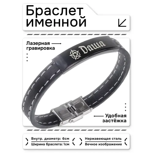 Именной браслет-оберег из кожи и нержавеющей стали с гравировкой.