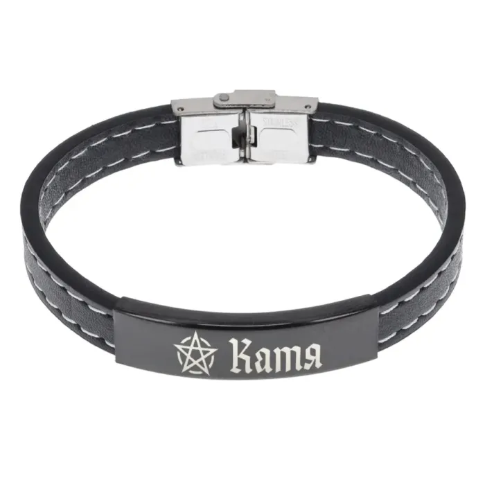 Именной браслет-оберег из кожи и нержавеющей стали с гравировкой.