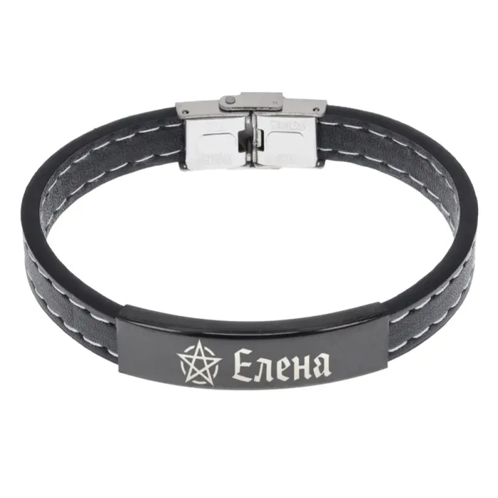 Именной браслет-оберег из кожи и нержавеющей стали с индивидуальной гравировкой.
