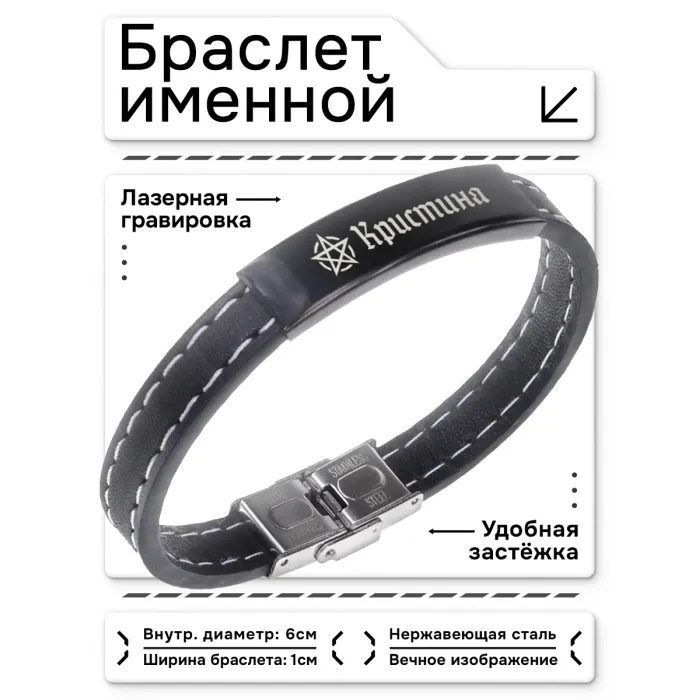 Именной браслет из кожи и нержавеющей стали с гравировкой.