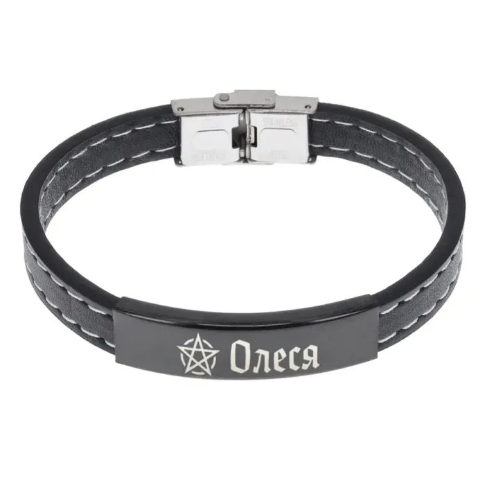 Именной браслет-оберег из кожи и нержавеющей стали с гравировкой.