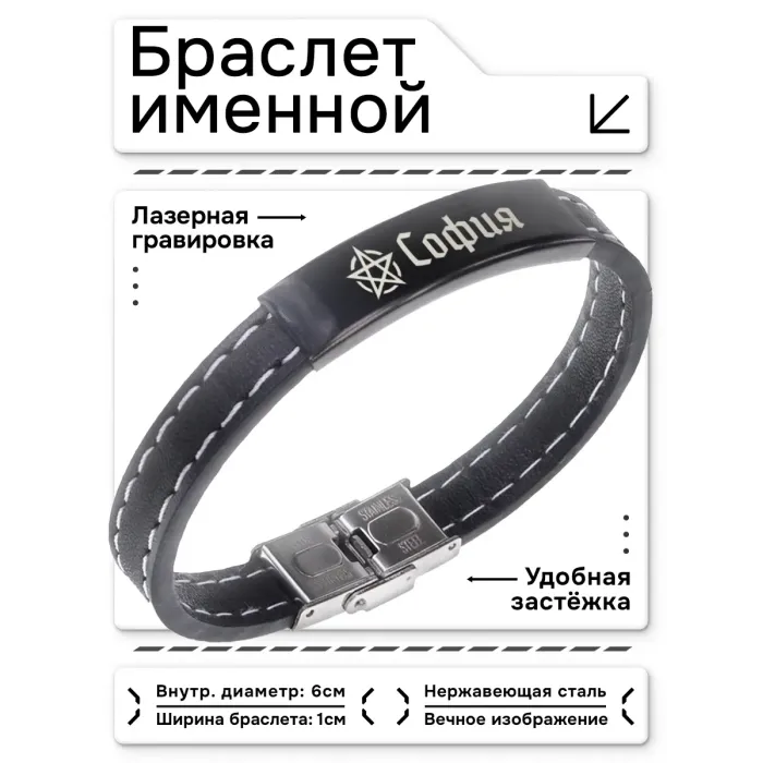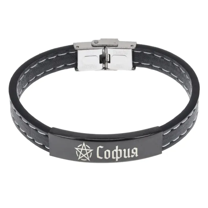 Именной браслет-оберег из кожи и нержавеющей стали с индивидуальной гравировкой.