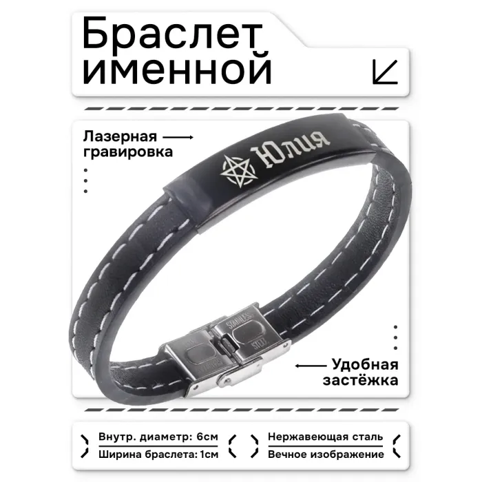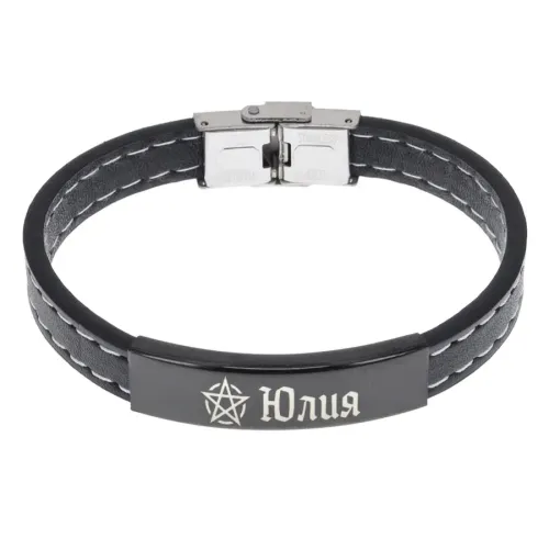 Именной браслет-оберег из кожи с элементами из нержавеющей стали и индивидуальной гравировкой.