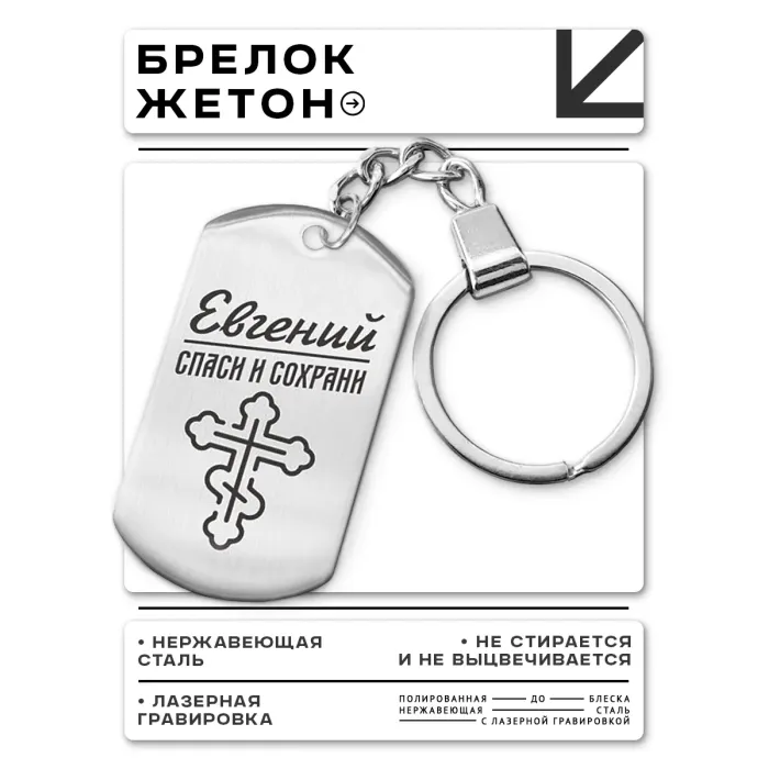 Именной брелок-жетон из нержавеющей стали с зеркальной полировкой и лазерной гравировкой.