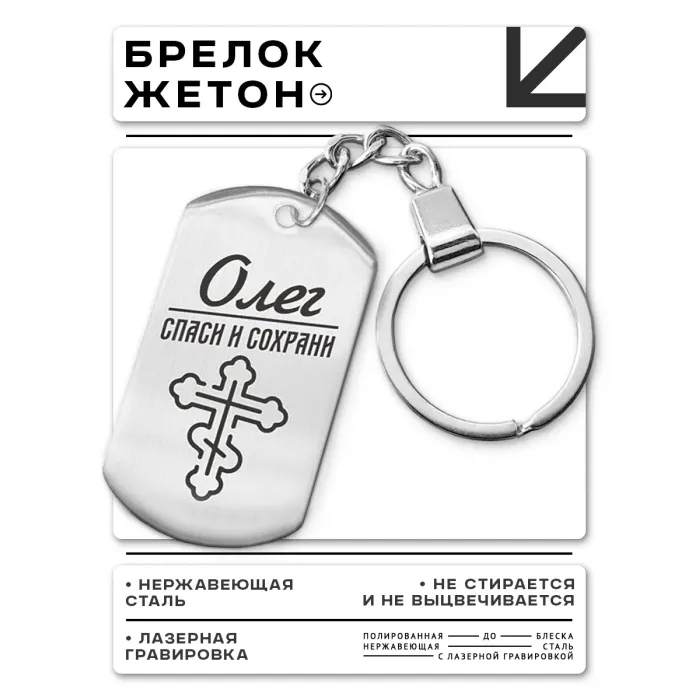 Именной брелок-жетон из нержавеющей стали с лазерной гравировкой.