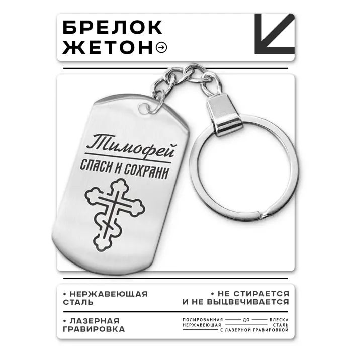 Именной брелок-жетон из нержавеющей стали с зеркальной полировкой.